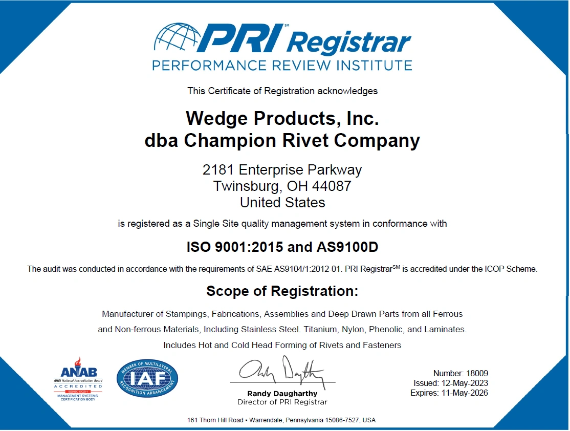 WEDGE PRODUCTS IS PROUD TO ANNOUNCE WE ARE NOW AEROSPACE CERTIFIED to AS9100 Rev. D